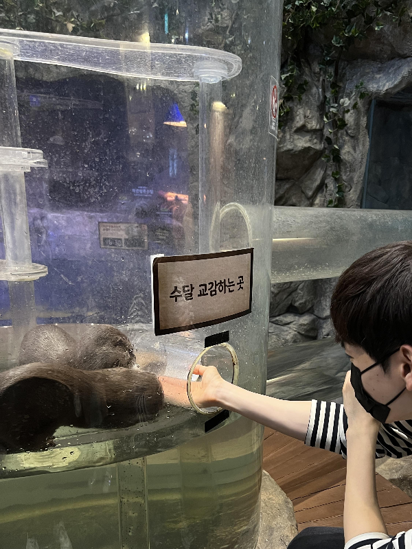 수달에 먹이 주기!! 수달을 본 것도 처음이고, 이렇게 가까이서 본 것도 처음이었다. 손가락이 5개였던 것이 인상 깊었다.