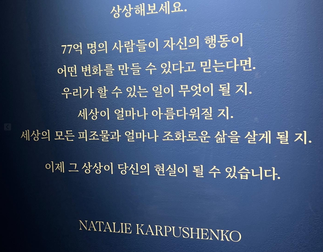 그라운드 시소 성수에서 하는 나탈리 카루프센코 사진전이었다. <나탈리 카르푸센코 사진전은 사진전의 제목에서 확인할 수 있듯이 나탈리 카르푸셴코라는 작가가 세계 각지의 섬과 바다를 돌아다니며 기록한 200여 장의 사진을 최초로 공개하는 사진전이다. 나탈리 카르푸셴코는 카자흐스탄 출신의 사진작가이자 환경 운동가로 자연보호, 해양 및 바다에 살고 있는 고래를 보호하는 행동을 직접적으로 실천해 나가는 인물로 이러한 예술 작업을 통해 사람들에게 영향을 주는 인플루언서로 활동하고 있다.