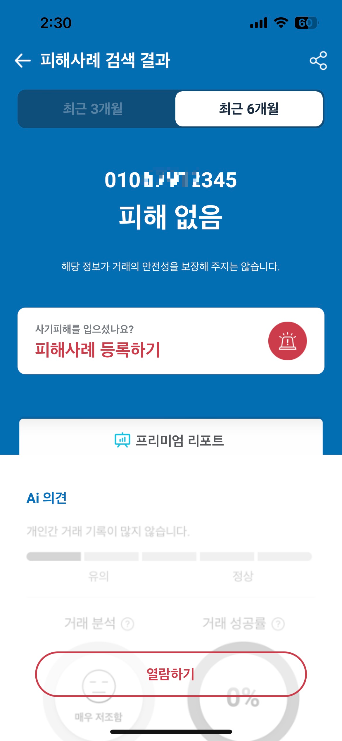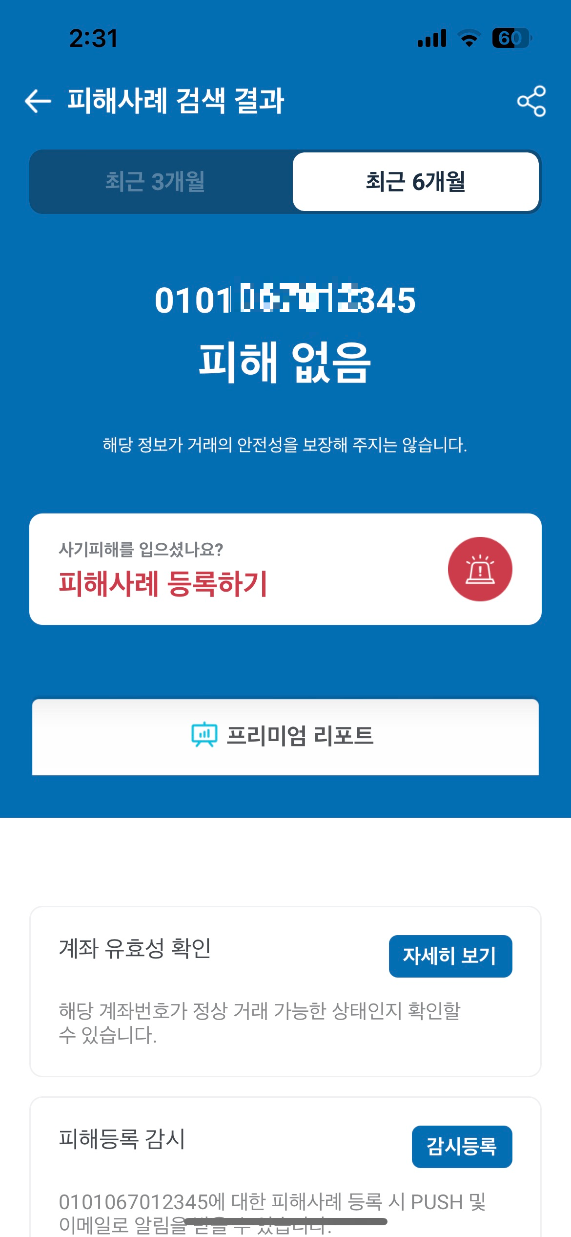 5. 더치트 검색 ; 최근 6개월 검색 결과, 휴대폰 번호와 계좌 번호 모두 '피해 없음'이 떴다. OK