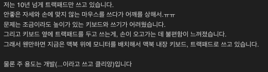트랙패드를 사기 위한 빌드업을 짜는 것이 아니라, 설문조사에 의하면 12명으로 압도적인 1위이다. 그래서 정말 필요할까? 에 대해 검색을 해보았다. 나의 마음은 고민할 것이 없는 것이, 이미 맥북 살 때 트랙패드에 대한 기대감이 있었기에 나의 마음은 이미 '사고 싶다'로 확고 한 상태였다. 그리고 요즘 큰 마우스 때문에 오래 쓰면 손목이 아파서 작은 마우스를 고려 중이었다.