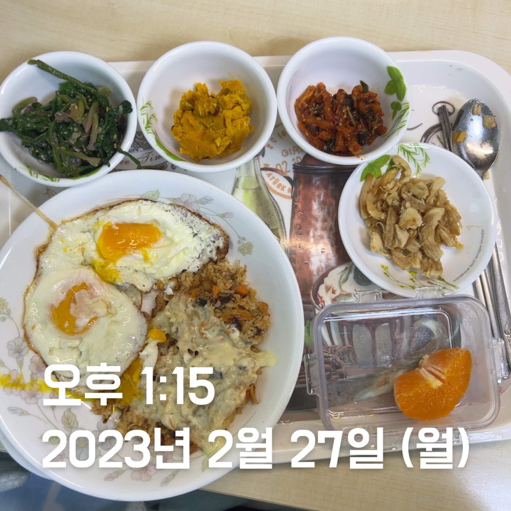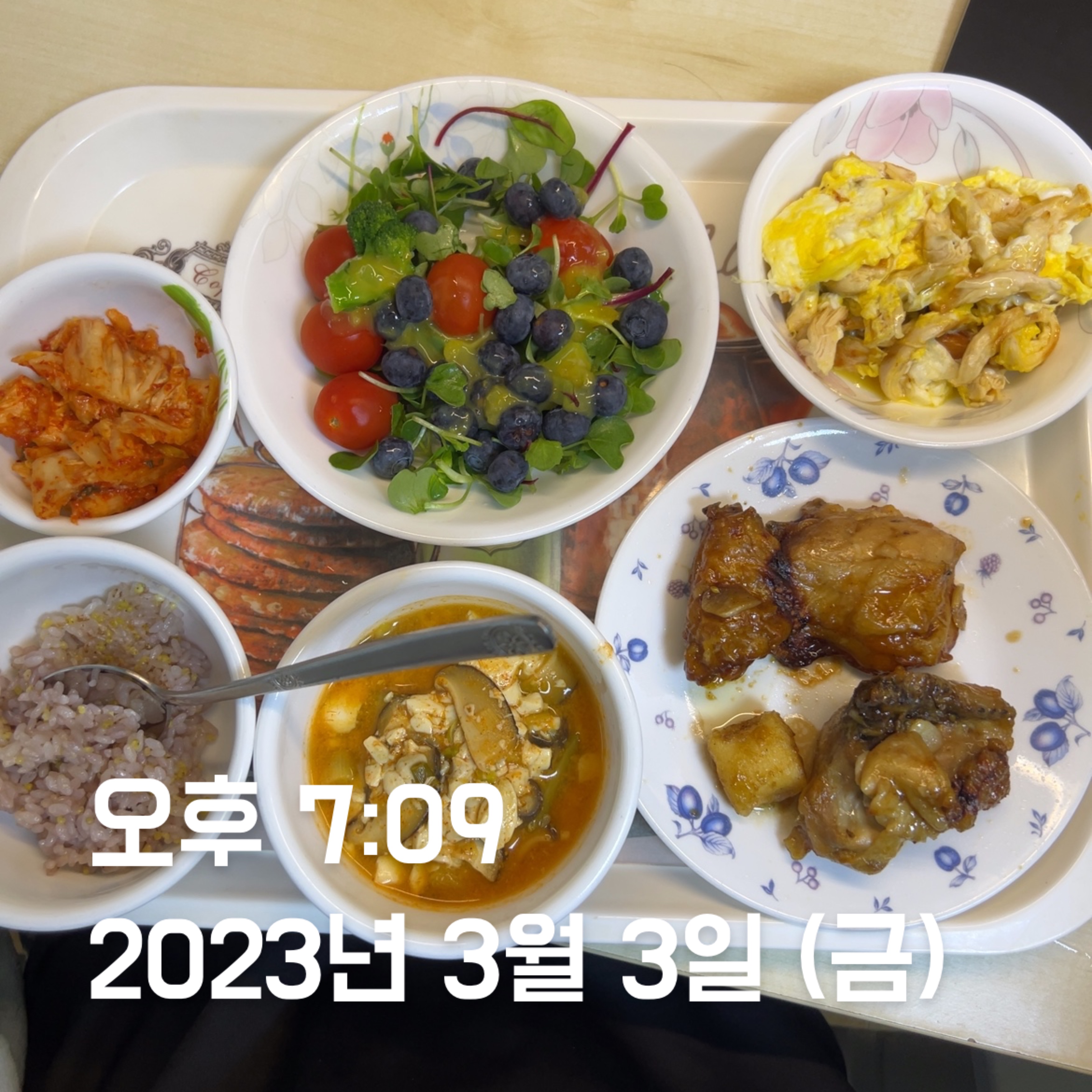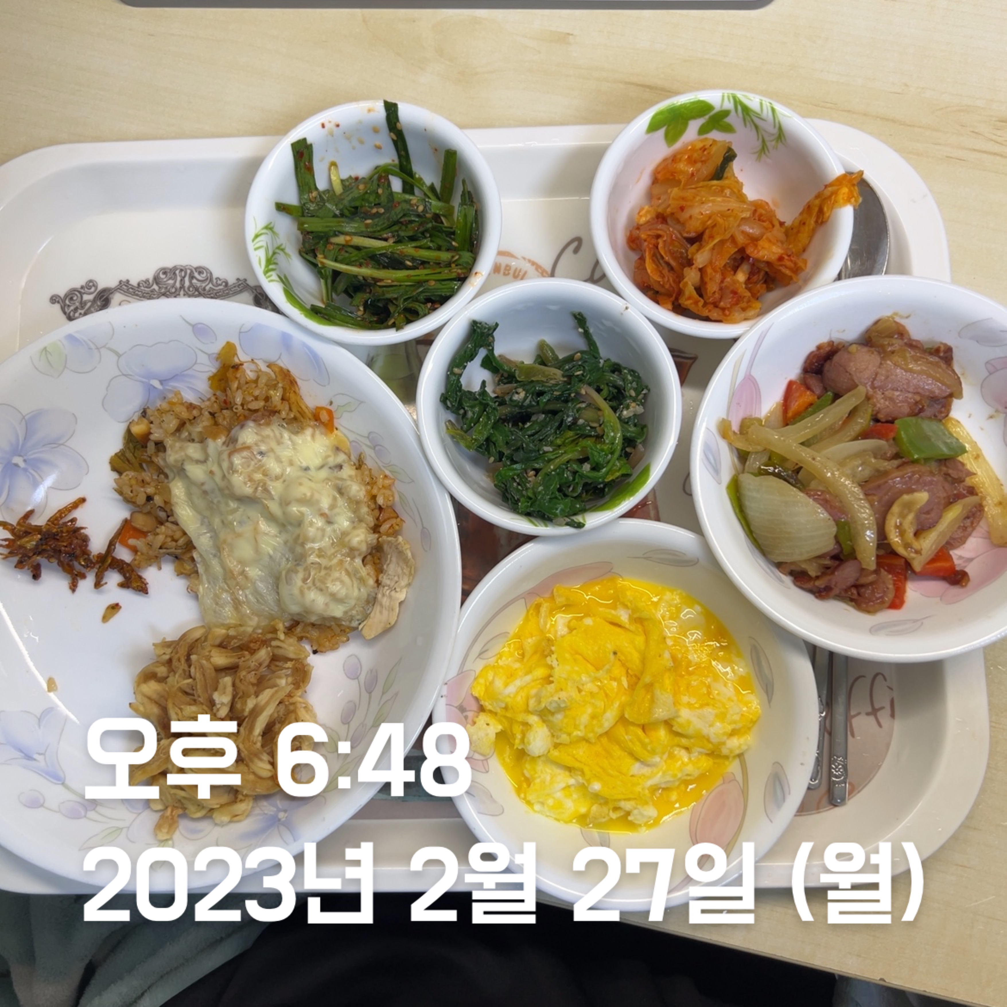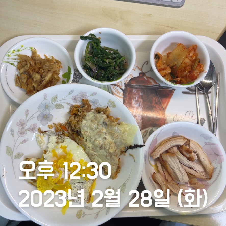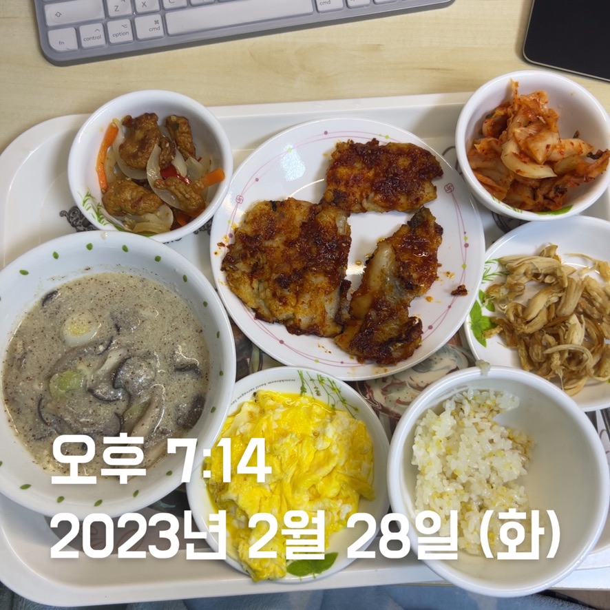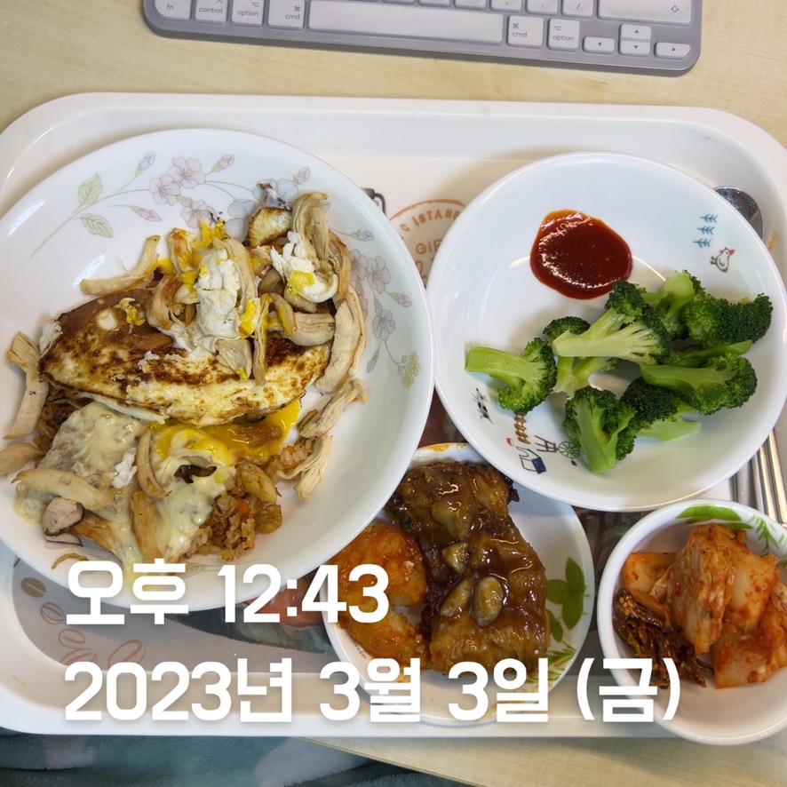 | 점심 | 빠네 스테이크 + 빠네 수프 | 천혜향 + 김치볶음밥 + 계란 2 + 닭가슴살 | 김치볶음밥 + 계란 2 + 닭가슴살 * 2 | 떡국 + 계란 2 + 닭가슴살 | 김치볶음밥 + 계란 2 + 닭가슴살 * 1 + 깐쇼 새우 + 닭강정 | 김치볶음밥 1/4 + 계란 1 + 닭가슴살 | 생선까스 + 계란 1 + 함박스테이크 |