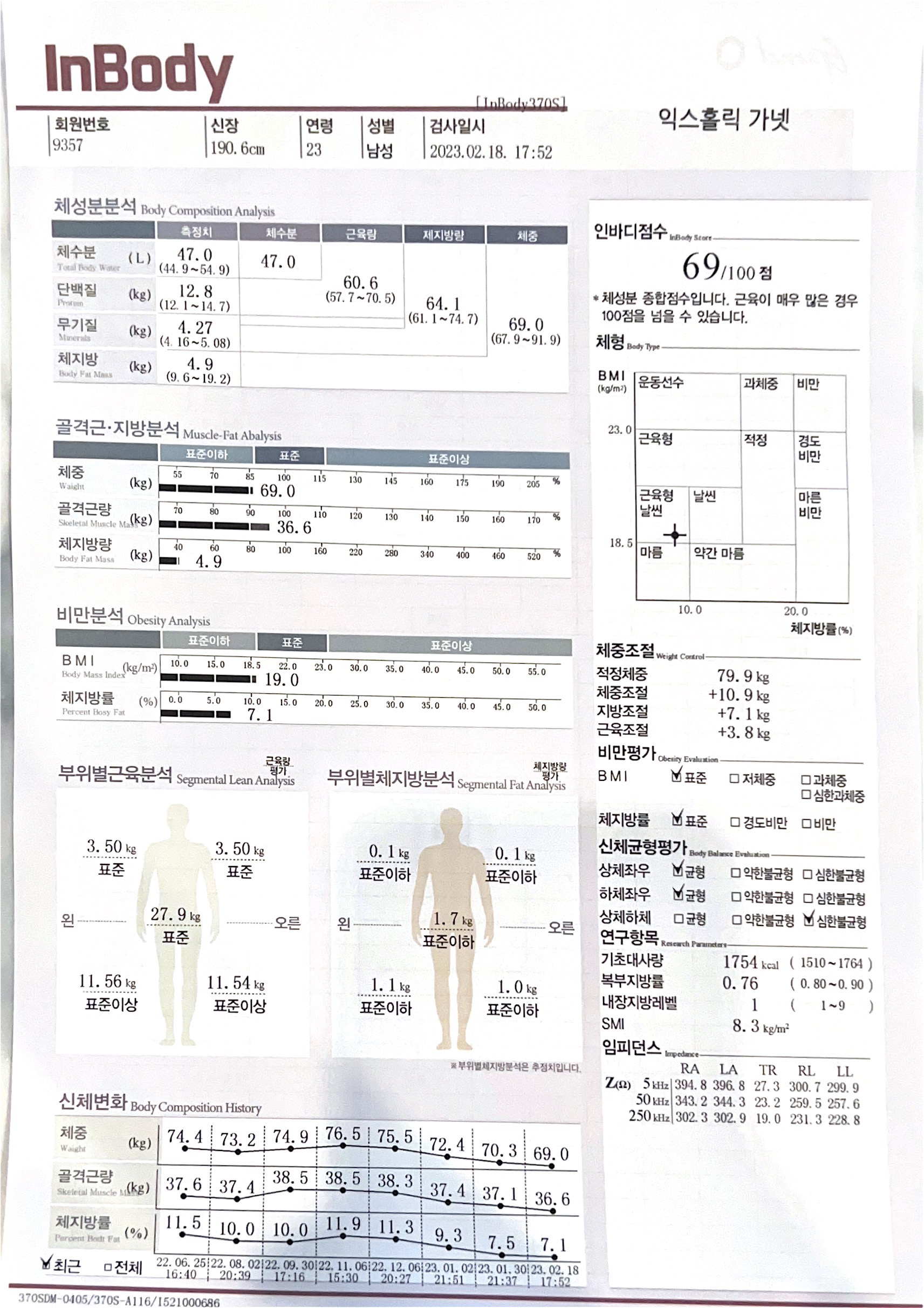 2주 만에 인바디 측정을 했다. 2주 전과 비교했을 때, 체중은 +0.8kg, 체지방률 +0.3%이다. 골격근량이 +0.1kg밖에 안 늘었다. 그래, 뭐 원래 근육이 급격하게 증가하지는 않는다. 이렇게 하다 보면 근육이 확 느는 때가 있을 것이다. 체지방률은 6%까지 낮출 생각 하지 말고, 지금처럼 7~8%대를 유지하자. 그 정도면 충분하다. 키 190에 69kg는 너무 마르긴 했다.