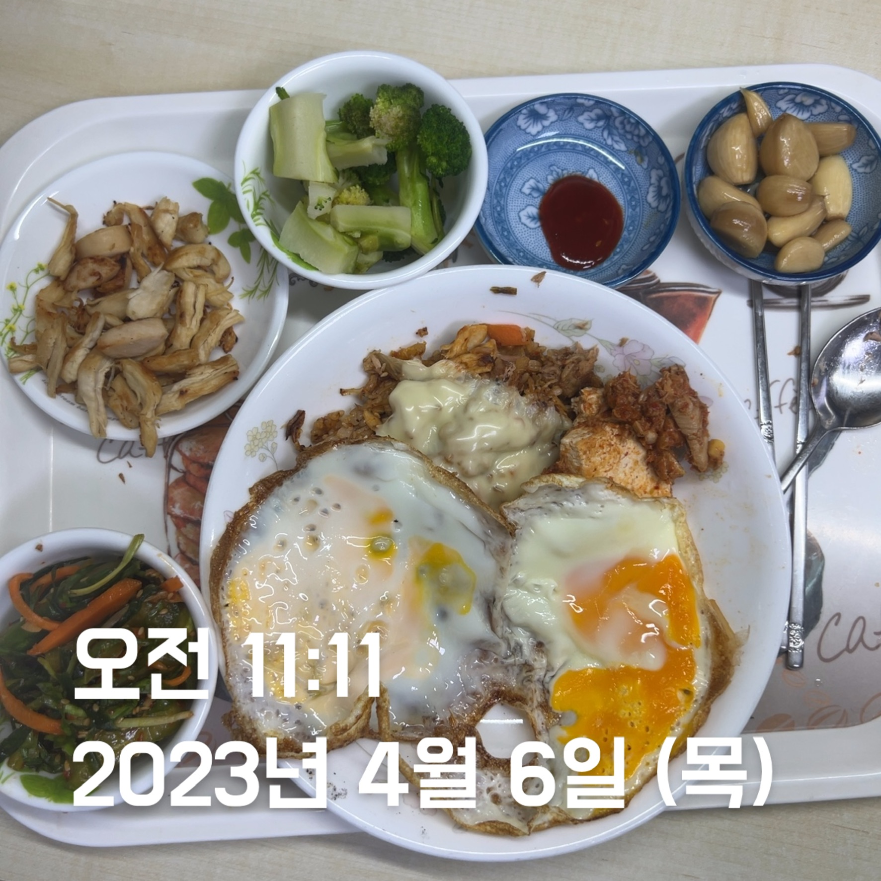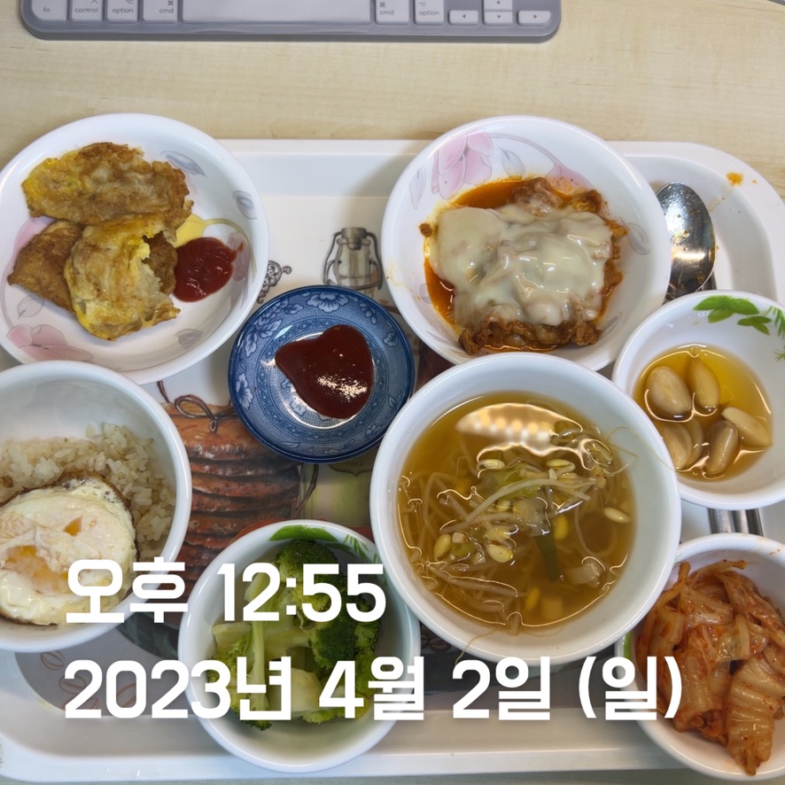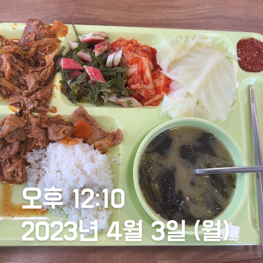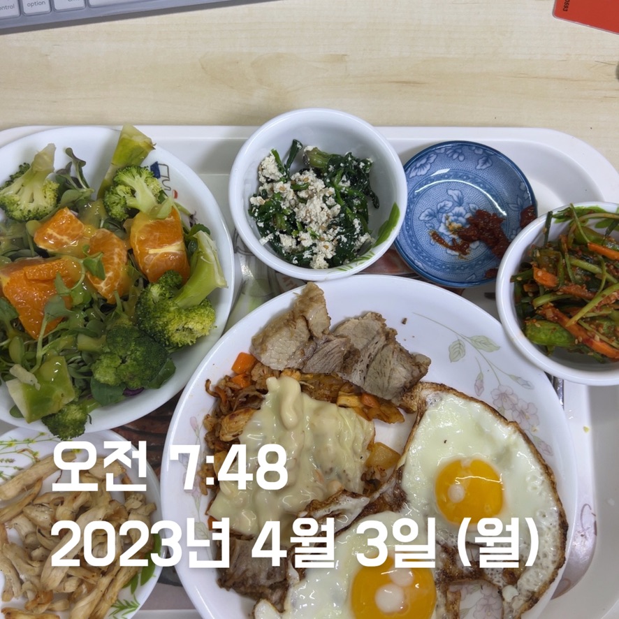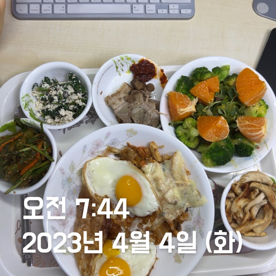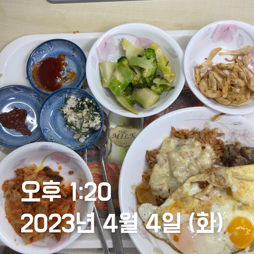 | 점심 | 제육볶음 + 생선전 + 계란 | 제육볶음 (학식) | 김치볶음밥 식단 + 수육 | 소시지 볶음(학식) | 김치볶음밥 식단 + 카레 + 스테이크 | 김치볶음밥 식단 | 오믈렛 |