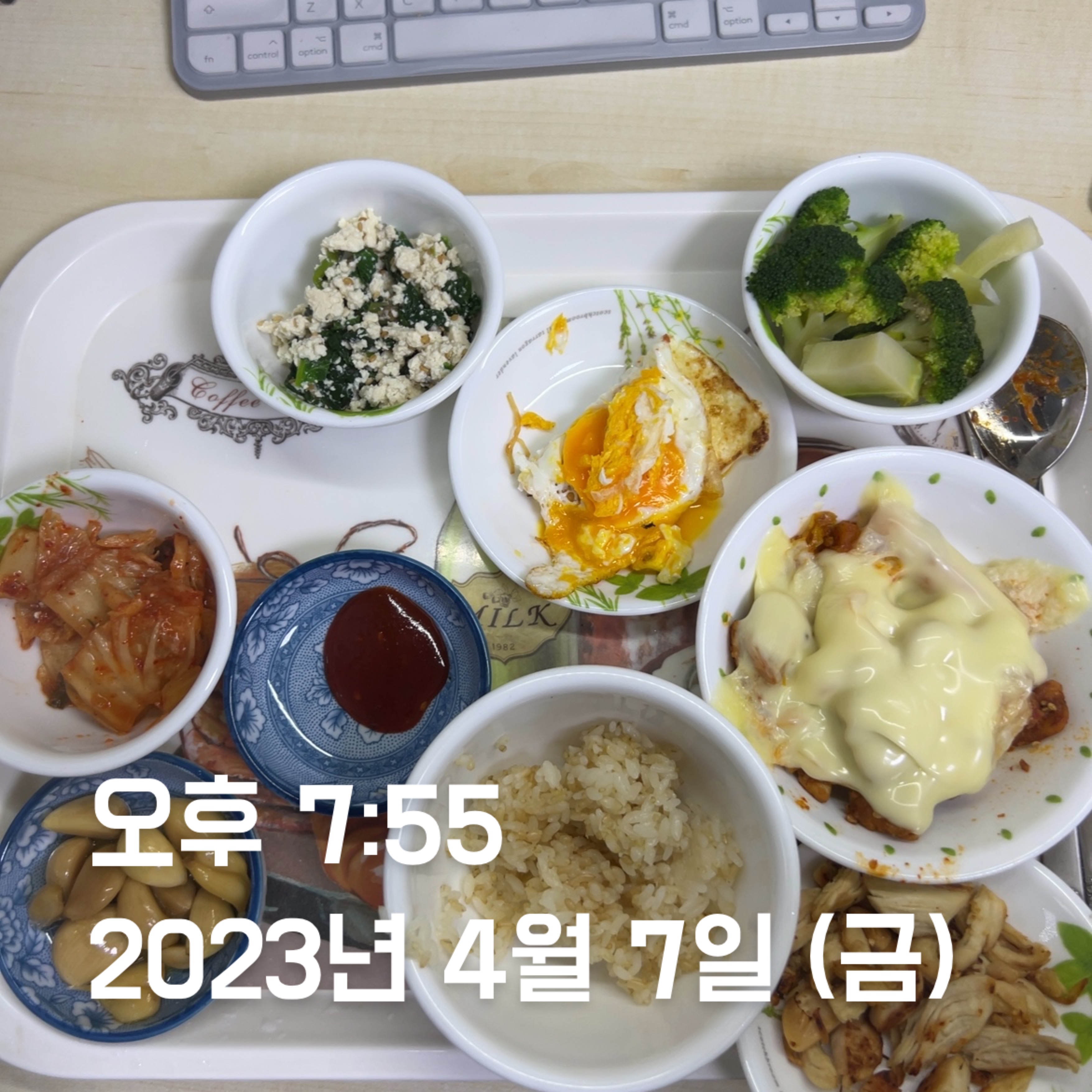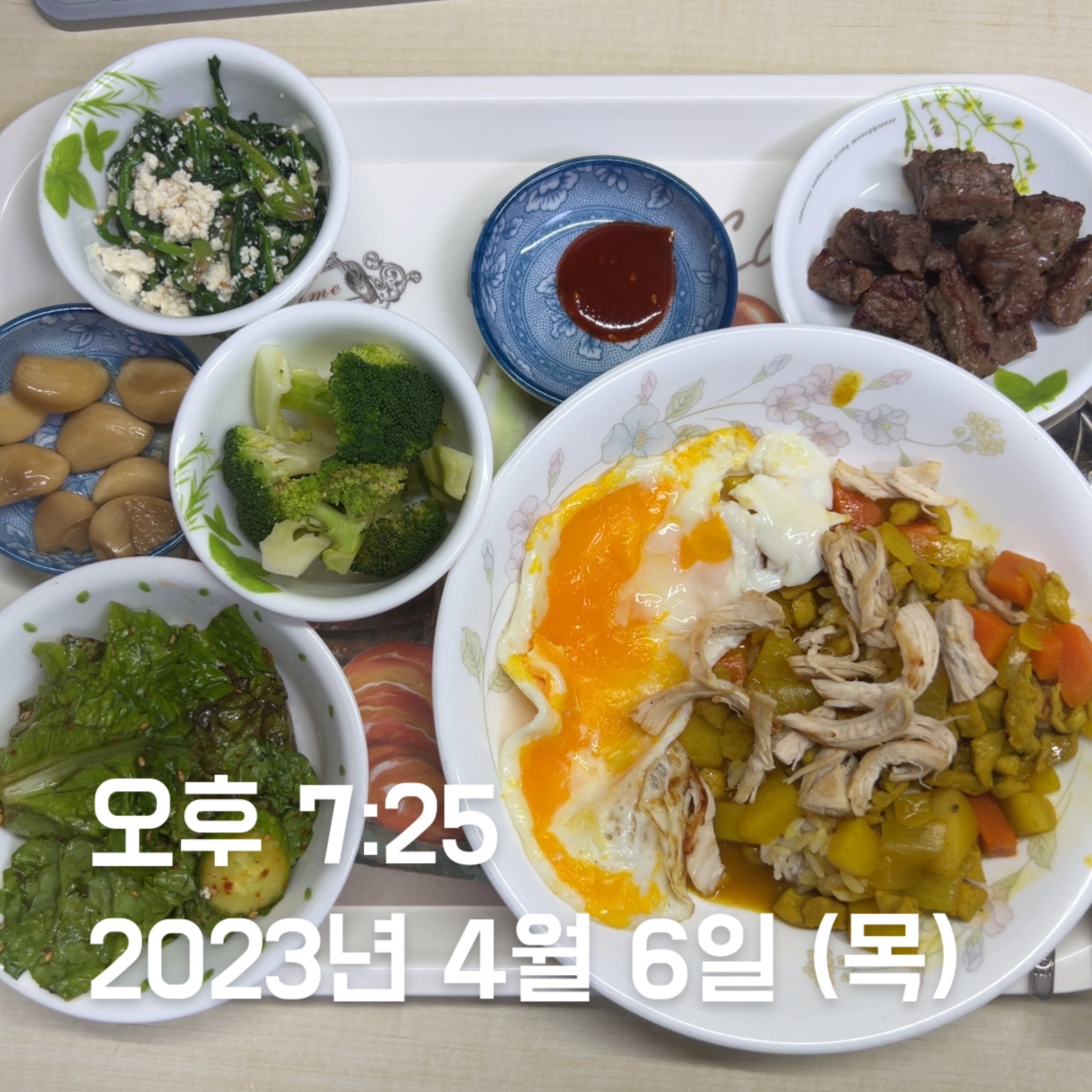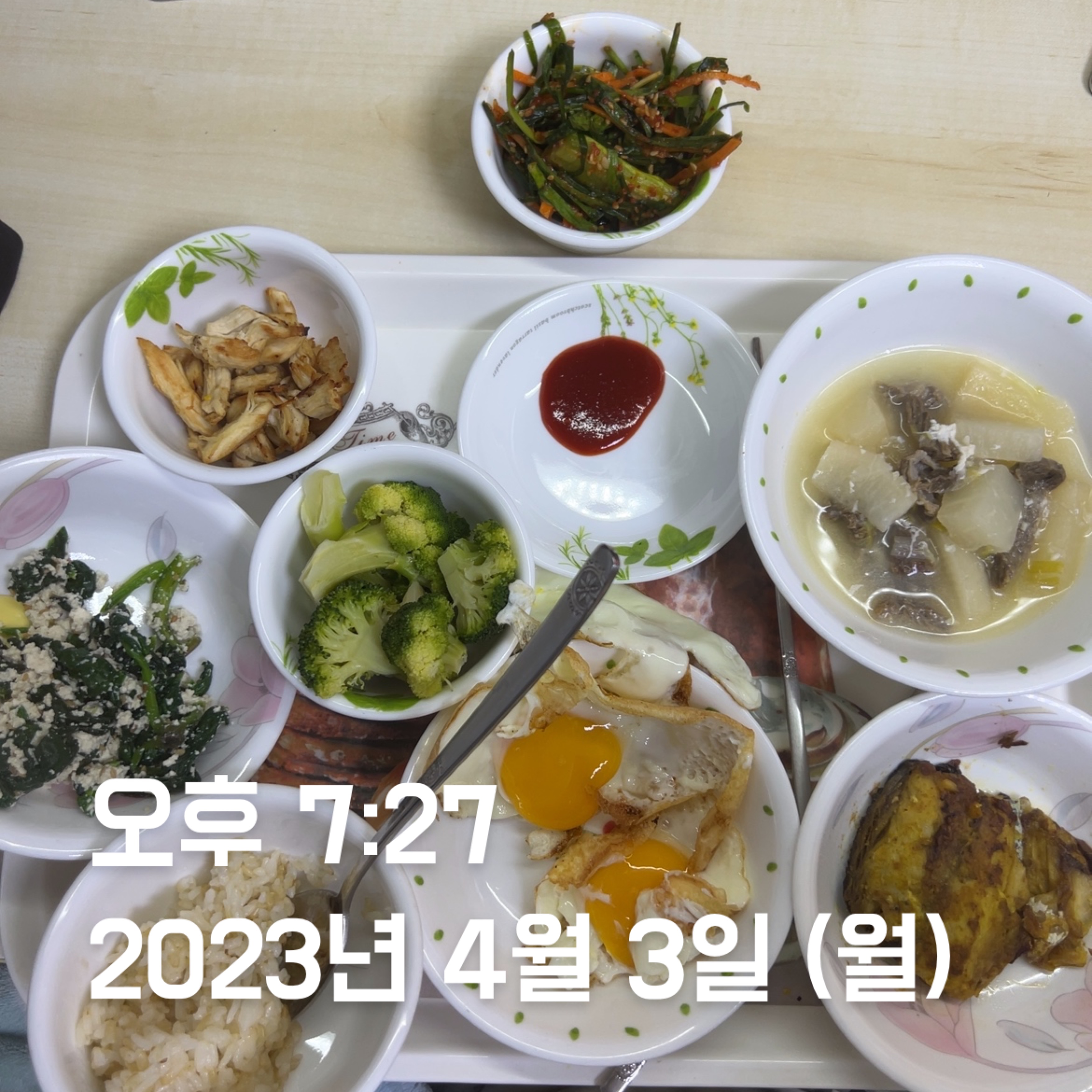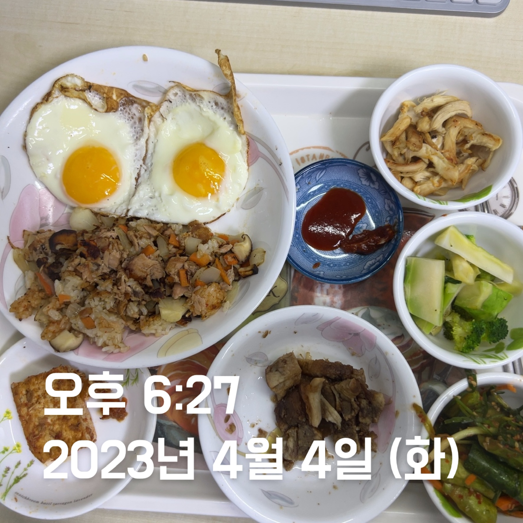 | 점심 | 제육볶음 + 생선전 + 계란 | 제육볶음 (학식) | 김치볶음밥 식단 + 수육 | 소시지 볶음(학식) | 김치볶음밥 식단 + 카레 + 스테이크 | 김치볶음밥 식단 | 오믈렛 |