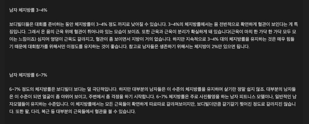 3~4%는 보디빌더들이 대회를 준비할 때 낮추는 체지방률이라고 한다. 그리고, 6~7%는 남자들이 이 체지방률을 유지하며 살기란 쉽지 않고, 얼굴이 좀 아위어보인다고 한다.