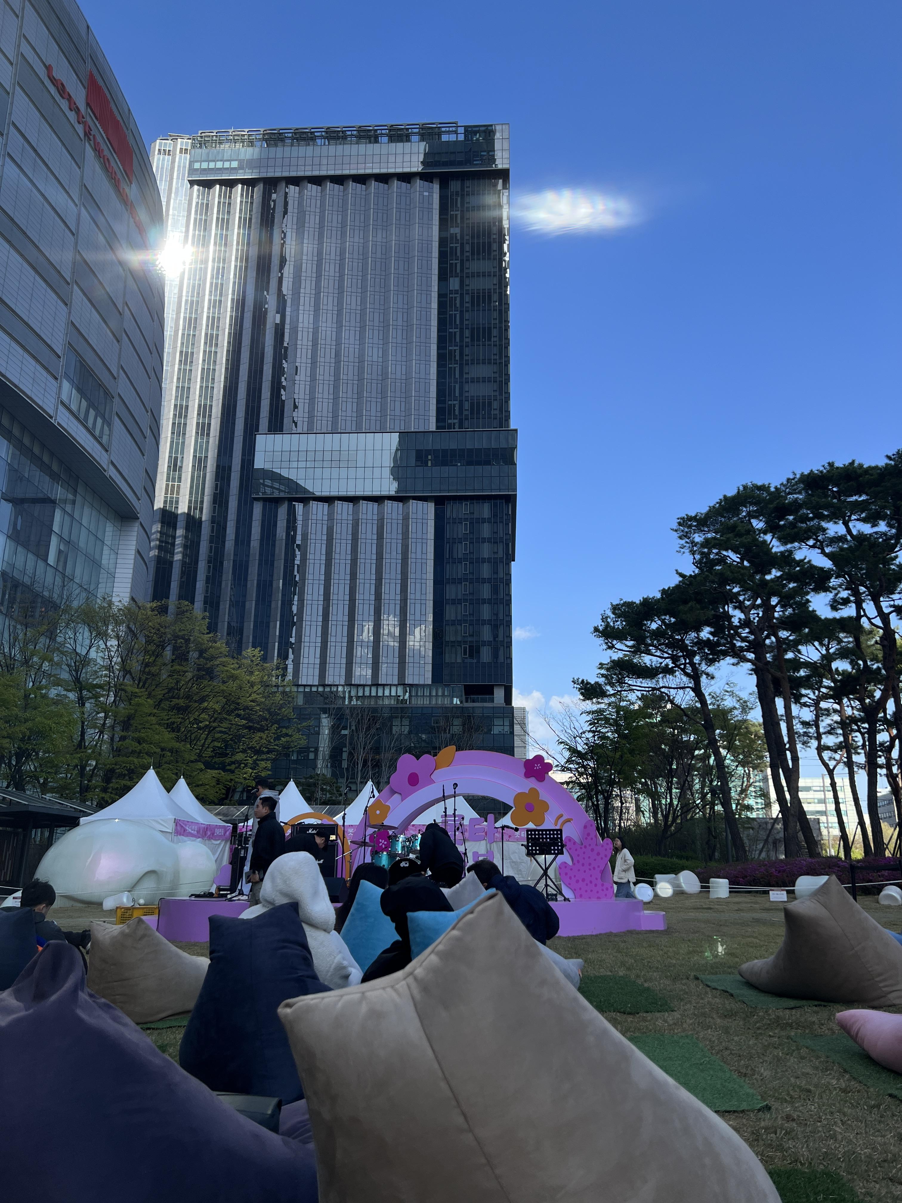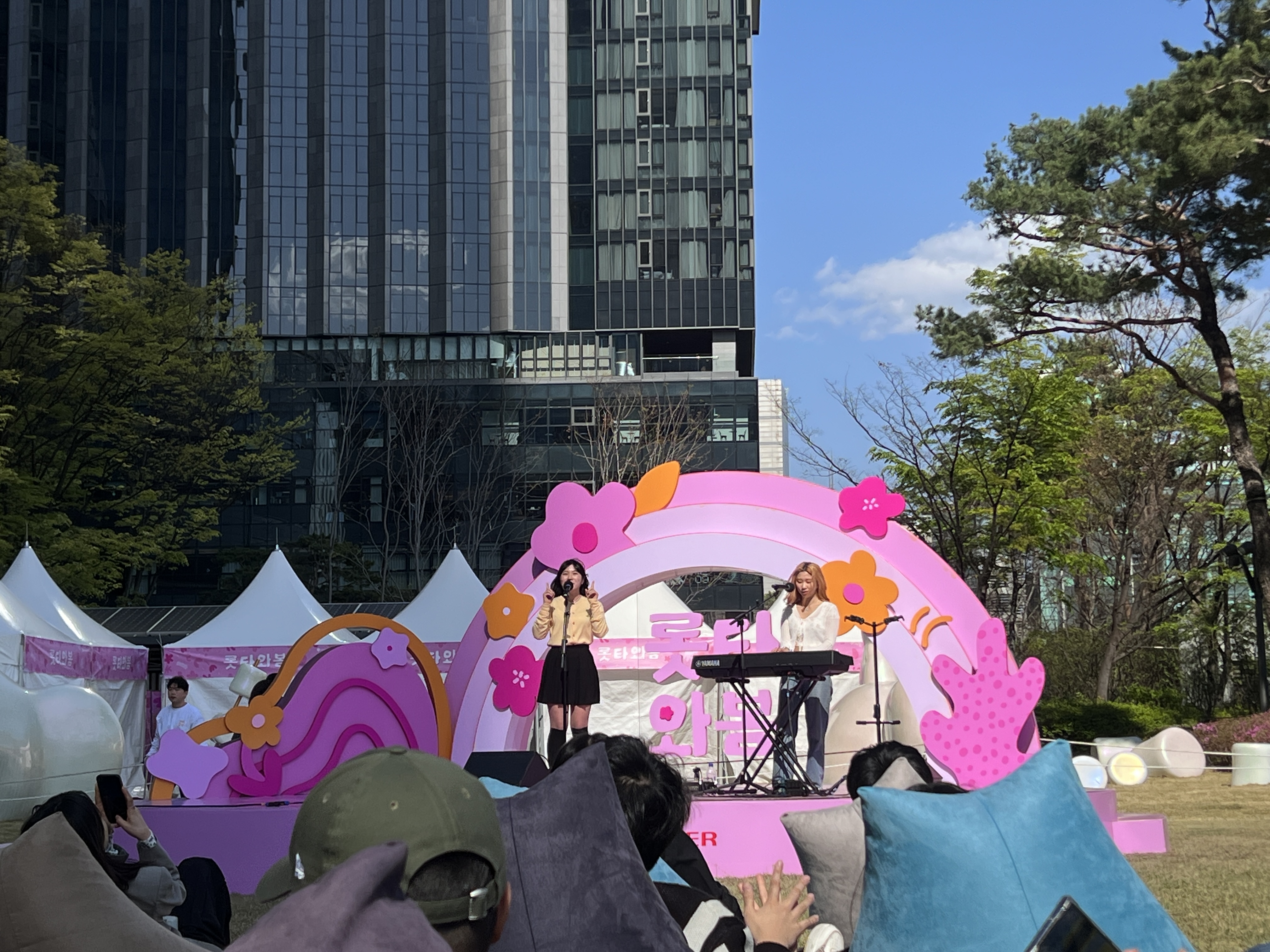 마침 오늘은 버스킹도 진행했다. 푹식푹신한 쿠션에 누워서 봤는데, 너무 편하고 즐거웠다. 보통 버스킹가면 좋아하지 않는 장르와 음악이 섞여 있곤 했는데, 이번 '롯타와봄'에서 들은 음악들은 하나같이 내 취향이었다. '벚꽃 엔딩','꽃송이가','우연히 봄' 모두 봄 컨셉의 음악들이라 봄기운이 내 몸에 흡수되는 기분이었다.