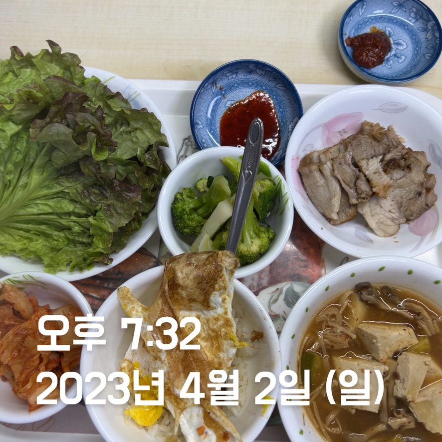 | 저녁 | 수육쌈 + 계란 | 갈치 + 계란 2 + 닭가슴살 | 볶음밥 식단 + 수육 | 돈까스 김치나베 | 닭갈비 | 팝콘 + 오징어 구이 + 콜라 | |