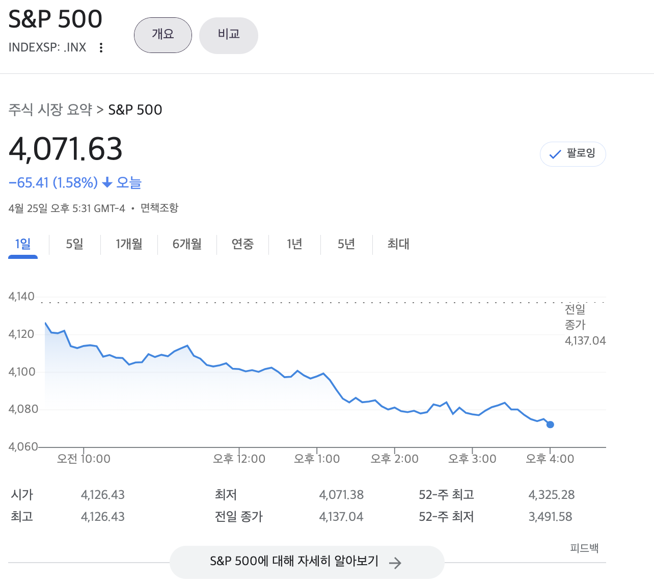 오랜만에 S&P500을 검색해보았는데, 하루만에 -1.58% 급락했다.. ㅎㄷㄷ