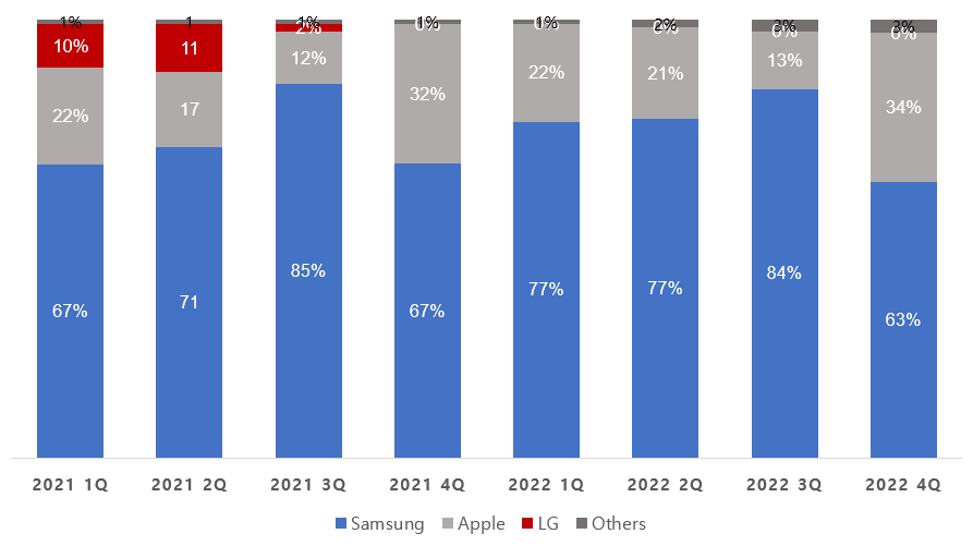 국내에서는 여전히 삼성이 한 몫을 하고 있는 것으로 보인다. 갤럭시 출시일(대략 6월 말)에 맞춰서 점유율이 3분이게 증가했다가, 4분기에 다시 감소하는 그래프를 볼 수 있다. 그럼에도 애플의 점유율은 10~30%로 무시할 수 없는 수치라는 것을 알 수 있다.