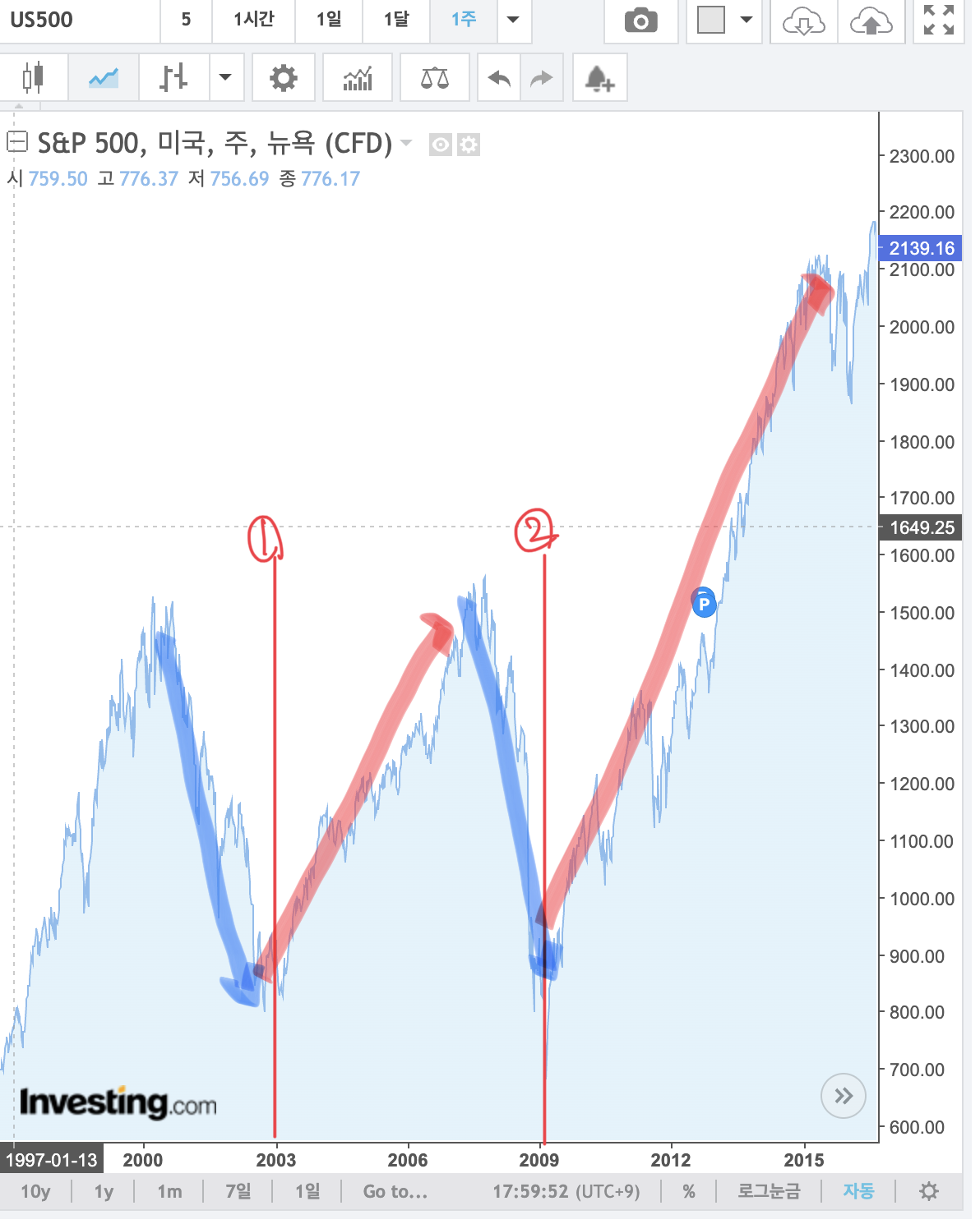1번이 2002년 닷컴 버블이고, 2번이 2009년 리만 브라더스 사태이다. 떨어질 당시만 보면 뒤도 안돌아보고 떨어졌지만, 1년에서 2년만 지나면 언제 그랬냐는 듯이 다시 회복하는 것을 볼 수 있다.