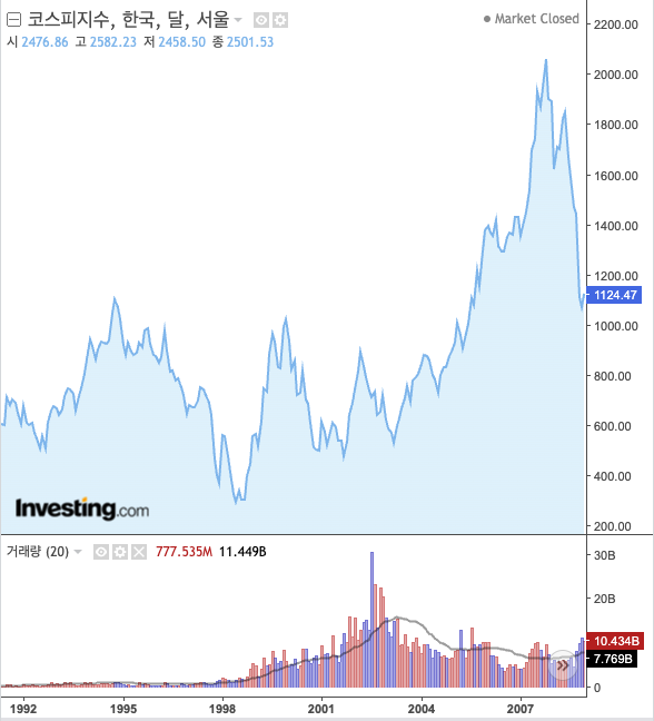 그에 반해 미국의 주가에는 큰 변동이 없었다. 2003년 닷컴 버블 전까지 순탄하게 주가가 올라갔다. 우리나라는 IMF위기, 닷컴 버블, 리만 브라더스 등 모든 사건마다 주가 등락을 반복했다.